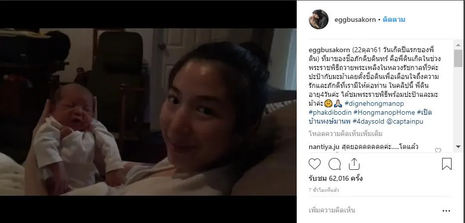 “วันนี้เมื่อ 1 ปีทีแล้วครอบครัวเราได้ต้อนรับสมาชิกใหม่ พี่ดินเป็นของขวัญที่มีค่าทีสุดในชีวิต พ่อขอให้ลูกเติบโต มั่งคง แข็งแรง เป็นคนดี มีแต่ความสุขความเจริญในชีวิตนะครับลูก สุขสันต์วันเกิดครับ 22 ตุลาคม 2561”