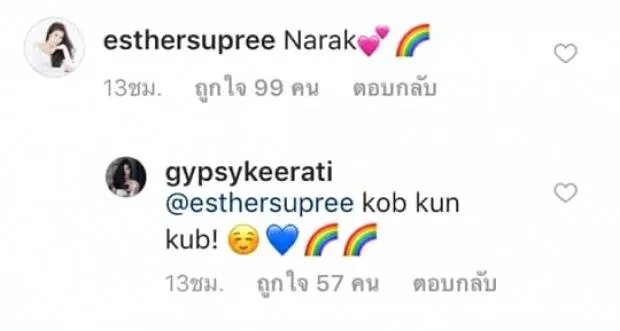 ก็ดูเหมือนความสัมพันธ์ระหว่างเอสเธอร์กับยิปซีจะกลับมาดูดีขึ้นซะอย่างนั้น เมื่อเอสเธอร์โผล่ไปคอมเม้นชมสาวยิป ใต้ภาพฟิตหุ่นสุดเฟิร์ม แบบสั้นๆแต่อ่านแล้วFCของสาวสาวต้องยิ้มว่า “น่ารัก”ด้านยิปซีก็มาคอมเม้นขอบคุณกลับเช่นกัน..
