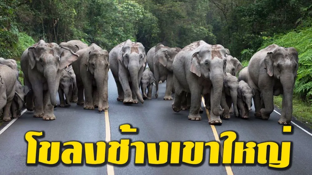 สะกดทุกสายตา! ของโขลงช้างป่าเขาใหญ่ ออกมาเดินบนถนน ที่หาชมได้ยากมาก