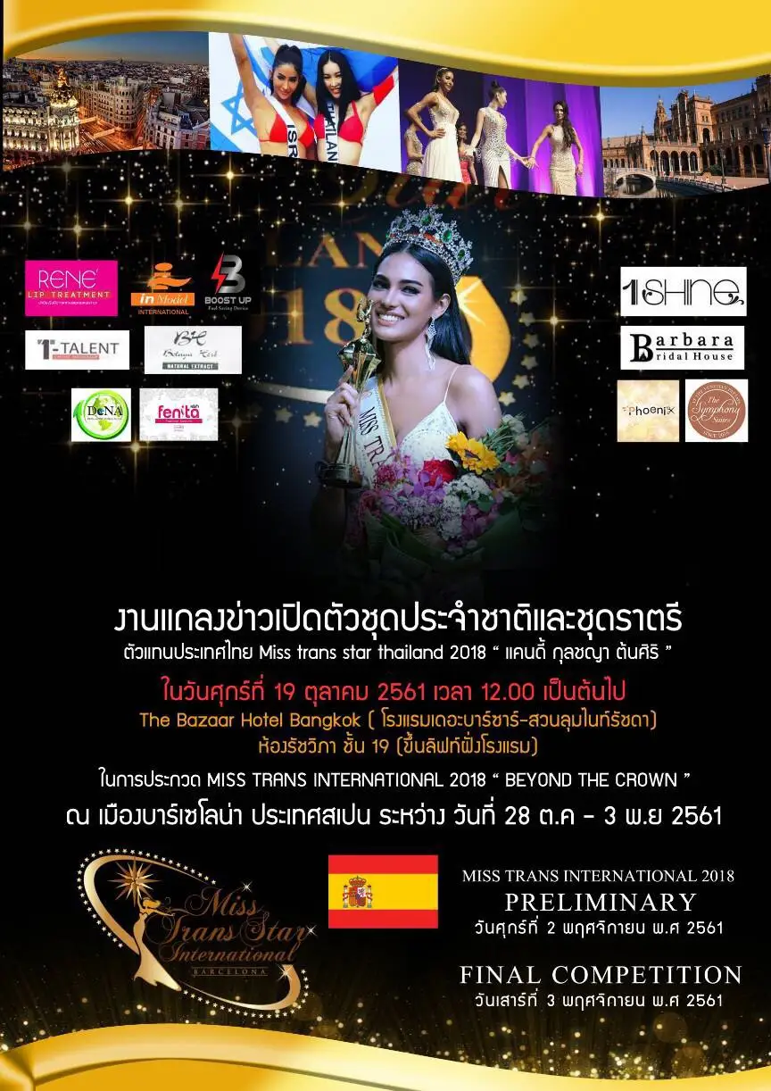 เข้มข้นถึงใจกองเชียร์สุดๆ สำหรับการประกวด “Miss Trans Star Thailand 2018 เวทีนางงามสาวประเภทสองอันดับต้นๆ ของประเทศไทย ซึ่งปีนี้สาวนัยน์ตาคม ผิวแทน มาแรงแซงทางโค้ง “แคนดี้-กุลชญา ตันศิริ” คว้ามงการันตีสวย-เก่งที่สุดบนเวที “Miss Trans Star Thailand 2018 โดยมี “สมชัย รัตนวรางกูร” ผู้อำนวยการกองประกวด “Miss Trans Star Thailand 2018” เตรียมพร้อมจัดหนักจัดเต็มกับงานแถลงข่าวเปิดตัวชุดประจำชาติและชุดราตรีไปแล้วเมื่อวานก่อน โดยตัวแทนประเทศไทย Miss Trans Star Thailand 2018 คนล่าสุด แคนดี้-กุลชญา เซอร์ไพร้ส์มาในชุดราตรีที่เปิดตัวในวันแถลงข่าวแบบอลังการงานสร้าง และยังมีอีกหลายชุดที่กองประกวดได้เตรียมไปใช้ในการแข่งขัน พร้อมเซอร์ไพร้ส์นี้ให้ได้เห็นเป็นประจักษ์สายตาพร้อมกันที่ประเทศสเปน