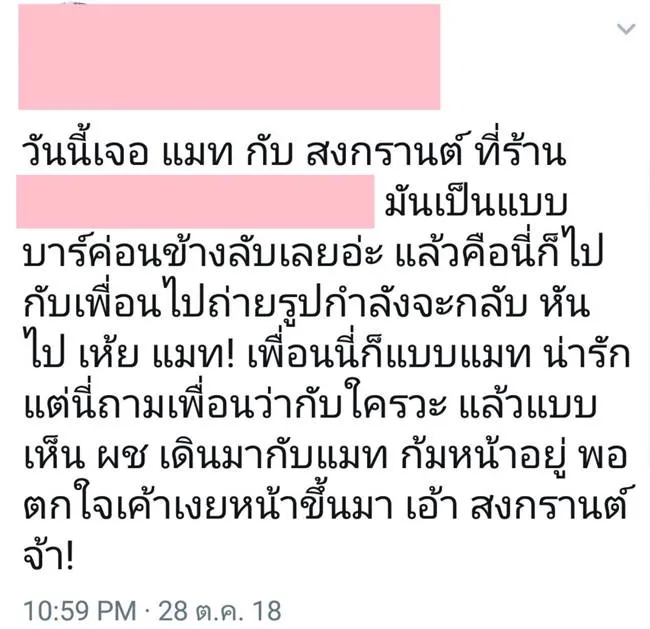 และล่าสุดก็มีข่าวเมาท์มาอีกรอบ โดยชาวเน็ตตาไวบอกว่าเจอทั้งคู่ “วันนี้เจอแมทกับสงกรานต์ที่ร้าน… มันเป็นแบบบาร์ค่อนข้างลับเลยอะ แล้วคือนี่ก็ไปกับเพื่อน ไปถ่ายรูปกำลังจะกลับ หันไป เห้ย แมท ! เพื่อนนี่ก็แบบแมทน่ารัก แต่นี่ถามเพื่อนว่ามากับใครวะ แล้วแบบเห็น ผช เดินมากับแมท ก้มหน้าอยู่ พอตกใจเค้าเงยหน้าขึ้นมา เอ้า สงกรานต์ จ้า !”