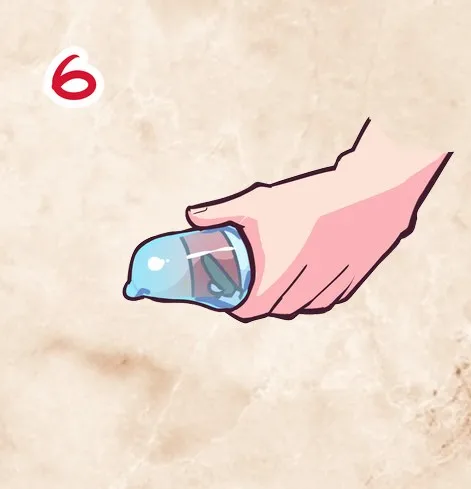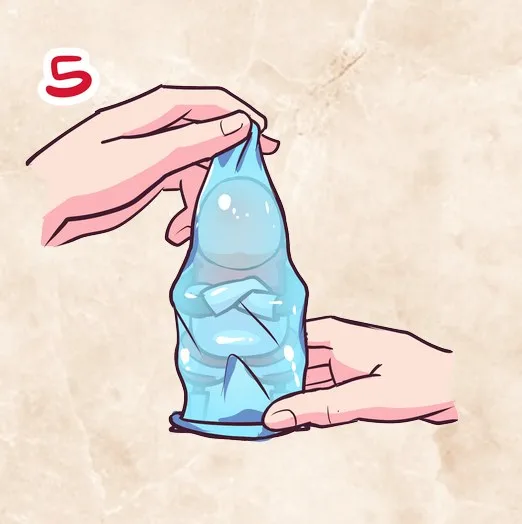 4. นิ้วมือข้างนึง บีบตรงกระเปาะปลายถุงยางไว้ให้สนิท ไม่ให้มีอากาศหลงเหลืออยู่ในนั้น
