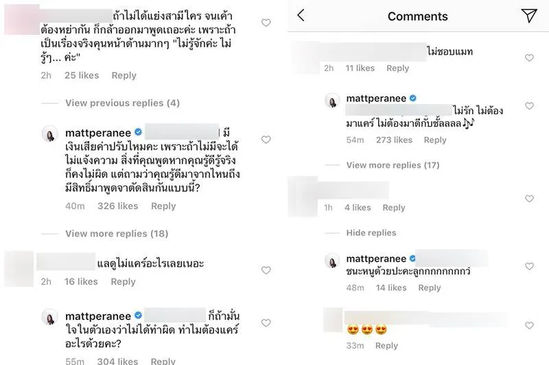 โดยแมทได้โต้ตอบชาวเน็ตที่เข้ามาคอมเมนต์ในเชิงตัดสินว่าตนเป็นจริงตามข่าว โดยระบุว่า “มีเงินเสียค่าปรับไหมคะ เพราะถ้าไม่มีจะได้ไม่แจ้งความ สิ่งที่คุณพูดหากคุณรู้ดีรู้จริงก็คงไม่ผิด แต่ถามว่าคุณรู้ดีมาจากไหนถึงมีสิทธิ์มาพูดจาตัดสินกันแบบนี้? ก็ถ้ามั่นใจในตัวเองว่าไม่ได้ทำผิด ทำไมต้องแคร์อะไรด้วยคะ”