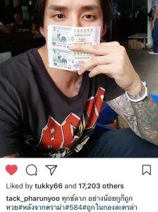 4.อีกหนึ่งดาราหนุ่มลุคเพลย์บอยที่มีความปัง “แทค ภรันยู” ที่เคยถูกรางวัลเลขท้าย3ตัว และยังเฮงต่อเนื่อง โดยเจ้าตัวได้โพสใน IG พร้อมระบุข้อความว่า “ทุกข์ลาภ อย่างน้อยกูก็ถูกหวย#หลังจากดราม่า#584#ถูกในกองละครล่าถือว่าปังทั้งเรื่องธุรกิจรีสอร์ทที่เชียงใหม่ แถมยังมากับดวงพ่วงไปอีกด้วย