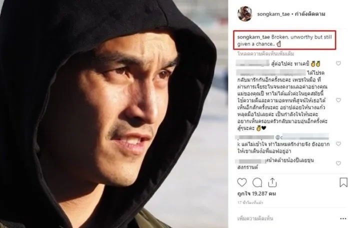 อย่างไรก็ตาม ตอกย้ำกับโพสต์ล่าสุด ของ สงกรานต์ อดีตสามี แอฟ โพสต์รูปตัวเอง พร้อมแคปชั่นว่า “Broken, unworthy but still given a chance..” โดยมีรูปเหมือนชูนิ้วก้อยด้วยนั้น โดยมีความหมายประมาณว่า แตกหัก ไม่มีค่า แต่ยังได้รับโอกาส