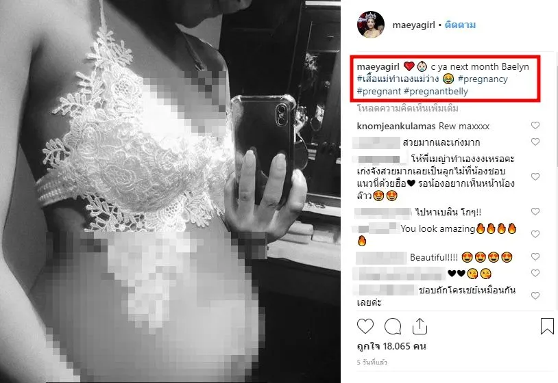 นอกจากนี้เธอยังได้โพสต์ภาพท้องของเธอที่ใกล้คลอดโดยระบุข้อความว่า "c ya next month Baelyn#เสื้อแม่ทำเองแม่ว่าง #pregnancy#pregnant #pregnantbelly"