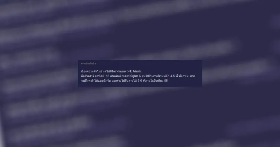 เรื่องความดังไม่รู้ แต่ไม่มีใครทำแบบ bnk ได้แน่ๆ คือวันเสาร์ อาทิตย์ 16 คนเล่นเธียเตอร์ มียูนิท 6 คนไปรับงานอีเวนท์อีก 4-5 ที่ ทั้งกทม. ตจว. จะมีใครทำได้แบบนี้ครับ แยกร่างไปรับงานได้ 5-6 ที่ภายในวันเดียว 55