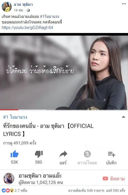 ได้กระเเสตอบรับจากแฟนๆเพลงเป็นอย่างดี สำหรับนักร้องสาวสวยมากความสามารถอย่าง “อาม ชุติมา” เเถมล่าสุดเธอก็สร้างปรากฏการณ์วงการเพลงลูกทุ่งอีกครั้งเเล้ว เพราะเมื่อปล่อยซิงเกิ้ลเพลงใหม่อย่าง ที่รักของคนอื่น ไปไม่ถึงวัน ยอดวิวก็ทะลุไป 1.5 ล้านวิวไปเเล้ว