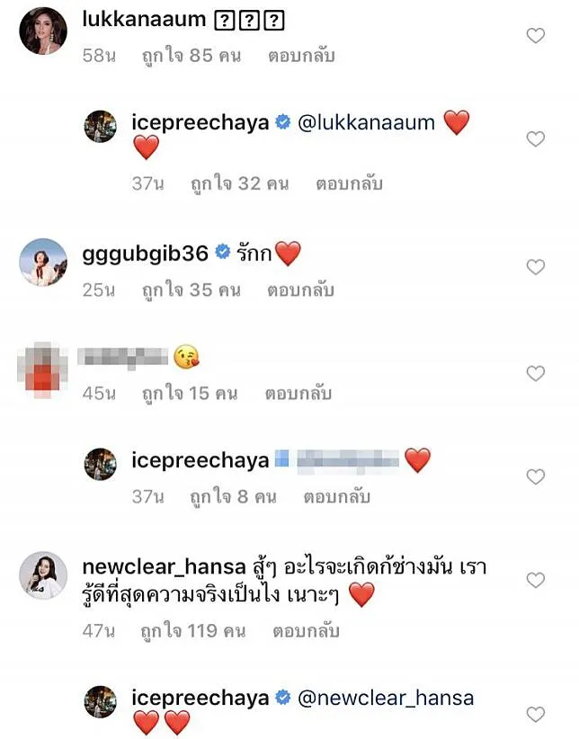จนมาล่าสุดสาวไอซ์ก็โพสต์ภาพ2 ภาพแต่ต่างอารมณ์ พร้อมกับแปคชั่นว่า”Just keep breathin Breathin Breathin breathin” แปลแล้วประมาณว่าแค่หายใจ หายใจ หายใจ หายใจเข้าไป จนทำอาเหล่าเพื่อนพ้องพี่น้องในวงการอาทิ อุ้ม ลักขญา กุ๊บกิ๊บ สุมณทิพย์ นิวเคลียร์ หรรษา รวมถึงเอฟซีเข้ามาส่งกำลังใจให้รัวๆ เลยทีเดียวจ้า แหม่! ดูท่าแล้วสาวไอซ์คงจะเฮิร์ตไม่เบา ซึ่งตอนนี้ก็เหลือแต่เพียงหนุ่มฮั่นอีกคนที่คงต้องออกมาเคลียร์ โดยวันนี้เจ้าตัวจะออกงานอีเว้นต์ในช่วงค่ำเอาเป็นว่ารอฟังกันเด้ออออค่า