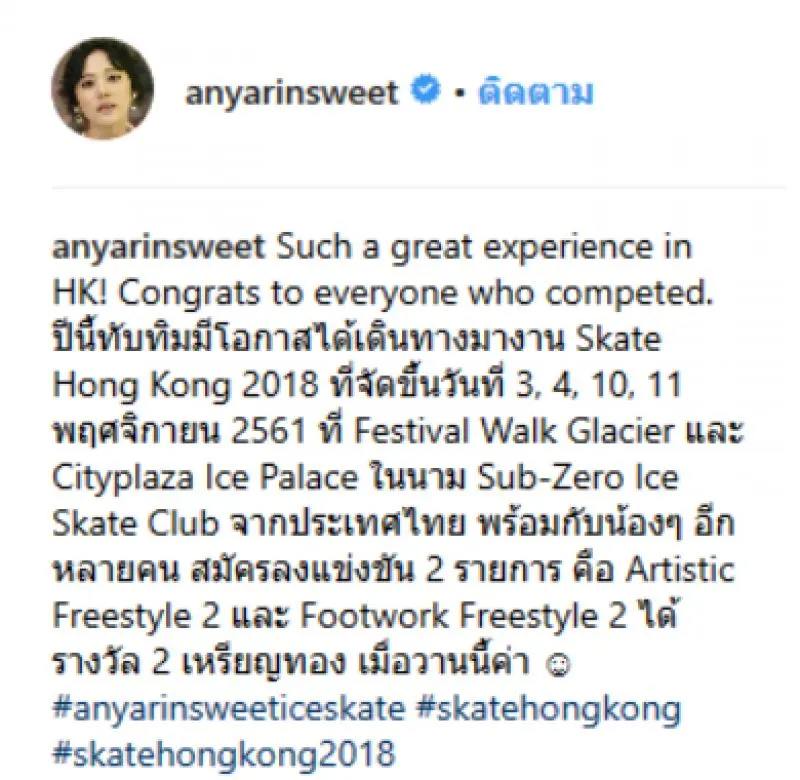 ถือเป็นดารามากความสามารถอีกหนึ่งคน สำหรับ “ทับทิม อัญรินทร์ ธีราธนันพัฒน์” ล่าสุด ได้รางวัล 2 เหรียญทองกีฬาไอซ์สเก็ต ที่งาน Skate Hong Kong 2018 โดยก่อนหน้าที่เธอก็เดินสายกวาดมาหลายรางวัลจากหลายงาน เรียกว่าทั้งสวย เก่ง และความสามารถรอบด้านจริงๆ โดยเธอก็ได้ออกมาโพสต์ผ่านอินสตราแกรม โดยระบุข้อความว่า…