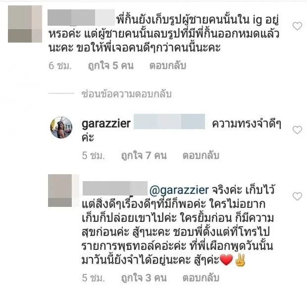 ล่าสุดก็ได้มีชาวเน็ตเข้ามาสอบถามว่า ทำไมถึงยังเก็บรูปฝ่ายชายไว้ ทั้งๆ ที่โอ๊ต ปราโมทย์ ได้ลบรูปคู่ที่เคยมีออกจากอินสตาแกรมแล้ว ซึ่งสาวกิ้น ได้ตอบกลับด้วยข้อความว่า “ความทรงจำดีๆ ค่ะ” โหยยอมรับเลยว่าเธอสตรองจริงๆ ยังไงก็ให้เป็นกำลังใจให้สาวกิ้นก้าวผ่านไปได้ไวๆนะจ๊ะ