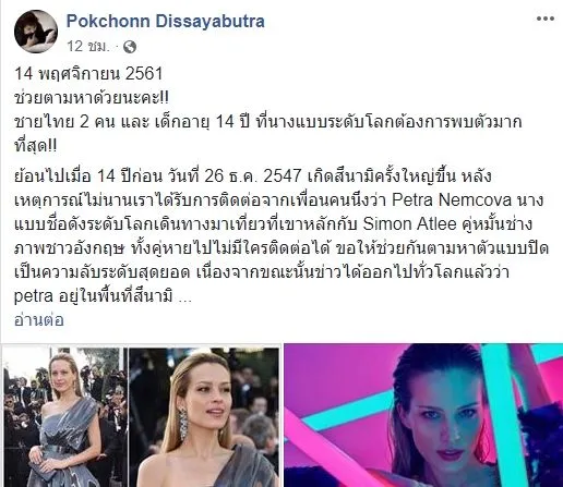 เรื่องราวดังกล่าว เป็นเรื่องของหญิงสาวผู้หนึ่งได้โพสต์ผ่าน เฟซบุ๊คส่วนตัว "Pokchonn Dissayabutra" เพื่อทำการช่วยเหลือนางแบบสาวระดับโลกที่กำลังตามหาตัวชายไทยที่ช่วยชีวิตเธอจากเหตุการณ์ "สึนามิ" สิบกว่าปีที่แล้ว โดยได้โพสต์ลงดังนี้ โดยมีข้อความตามโพสต์ดังนี้ "14 พฤศจิกายน 2561 ช่วยตามหาด้วยนะคะ!! ชายไทย 2 คน และ เด็กอายุ 14 ปี ที่นางแบบระดับโลกต้องการพบตัวมากที่สุด!! ย้อนไปเมื่อ 14 ปีก่อน วันที่ 26 ธ.ค. 2547 เกิดสึนามิครั้งใหญ่ขึ้น หลังเหตุการณ์ไม่นานเราได้รับการติดต่อจากเพื่อนคนนึงว่า Petra Nemcova นางแบบชื่อดังระดับโลกเดินทางมาเที่ยวที่เขาหลักกับ Simon Atlee คู่หมั้นช่างภาพชาวอังกฤษ