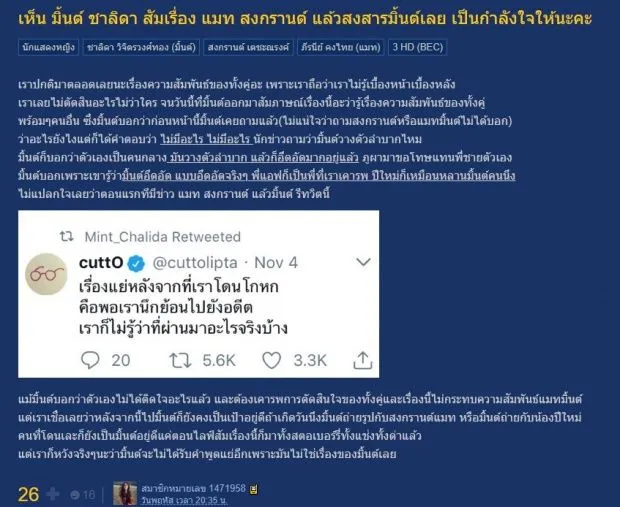 แต่ก็ไม่วายถูกชาวเผือกบางกลุ่มขุดขึ้นมาอีกครั้ยง เพราะล่าสุดความสัมพันธ์ของสองเพื่อนซี้แก๊งเฟอร์บี้ไม่ขายฝัน ระหว่าง มิ้นท์และ แมท เริ่มสั่นคลอน เพราะได้มีชาวเน็ตเข้าไปขุดเจอว่าช่วงที่ต้นเดือนพฤศจิกายนที่ผ่านมา ซึ่งเป็นเวลาที่กระแสข่าวความรักของ แมทและสงกรานต์ เริ่มถูกขุดคุ้ยและพูดคุยกันในโลกโซเชียลกันอย่างมาก คนที่โดนด่าหนักไม่แพ้กันก็คือ มิ้นท์ และช่วงเวลาดังกล่าว มิ้นท์ได้รีทวิต”คำคม”เก๋ๆที่มีเนื้อหาถึงความเชื่อใจและคำโกหกของนักร้องหนุ่ม คัตโตะ วงลิปตา ว่า “เรื่องแย่ๆหลังจากที่เราโดนโกหก คือพอเรานึกย้อนไปยังอดีตเราก็ไม่รู้ว่าที่ผ่านมาอะไรจริงบ้าง?”
