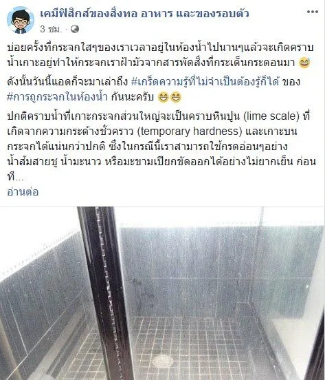 เป็นอีกหนึ่งปัญหากวนใจหลายๆ บ้าน สำหรับปัญหาฝ้าในกระจกห้องน้ำ ที่เป็นกระจกกั้นห้องอาบน้ำ มักจะเกิดฝ้าเป็นคราบน้ำเกาะ มั่วไม่ใสเหมือนเดิม วันนี้จะพาไปดูวิธีการแก้ปัญหาฝ้ากระจกให้กลับมาใสเหมือนใหม่อีกครั้ง ด้วยวิธีการง่ายๆ จากทางเพจ เคมีฟิสิกส์ของสิ่งทอ อาหาร และของรอบตัว ได้โพสต์สาระดีๆ พร้อมวิธีถูกระจกให้กลับมาใส โดยระบุว่า...