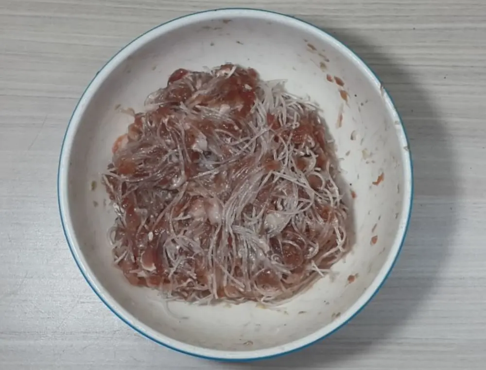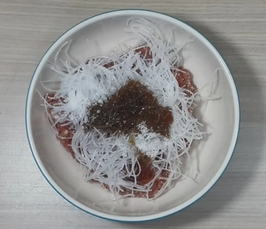 1.ปรุงรสหมูสับโดยใส่สามเกลอ น้ำตาล 2 ช้อนชา ซอสปรุงรส 2 ช้อนชา น้ำมันหอย พริกไทย วุ้นเส้น