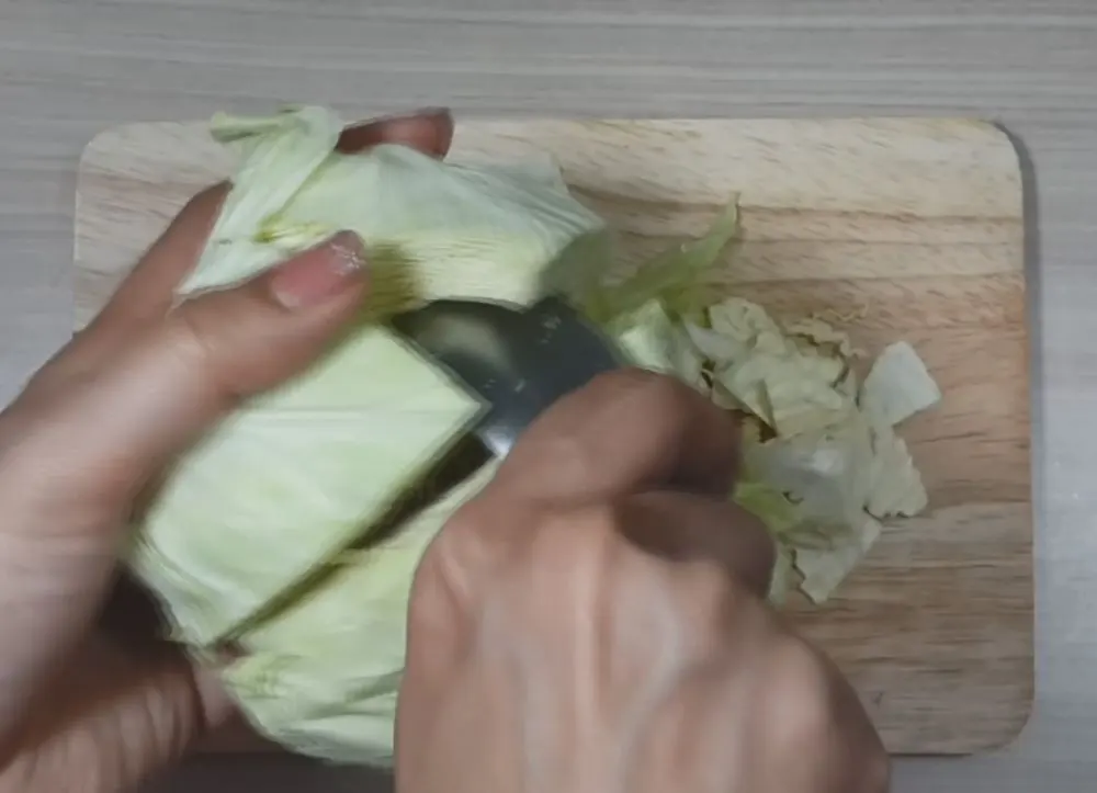 2.ผ่ากะหล่ำปลีเป็นสี่แฉกควักไส้กลางให้เหลือความหนาของฉันผักครึ่งหนึ่ง