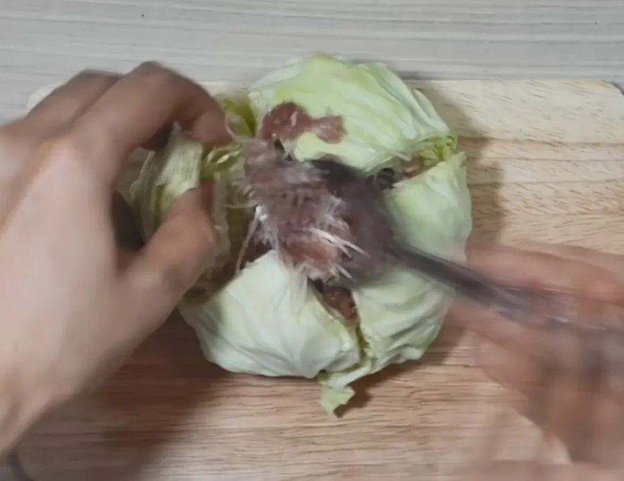 3.นำหมูที่ปรุงรสไว้สับยัดใส่กะหล่ำปลีให้เต็ม