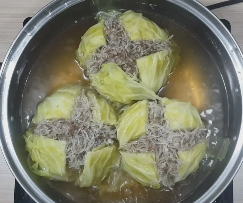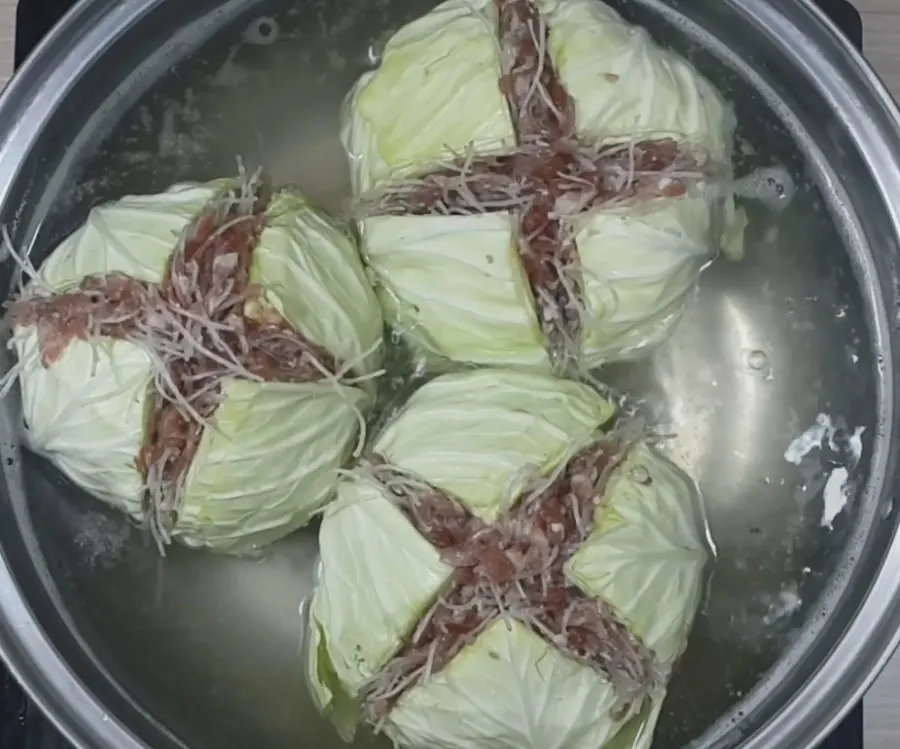 4.ตั้งน้ำใส่เกลือเมื่อน้ำเดือดใส่กะหล่ำปลีลงไปต้มไฟอ่อนประมาณ 25 นาทีจนกะหล่ำปลีสุกทั่วกัน