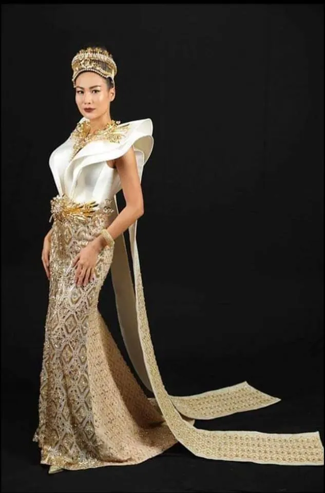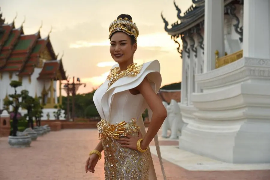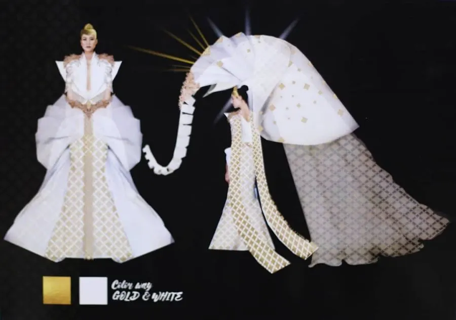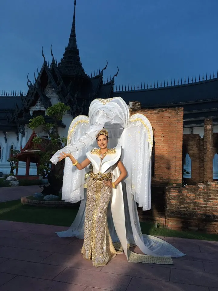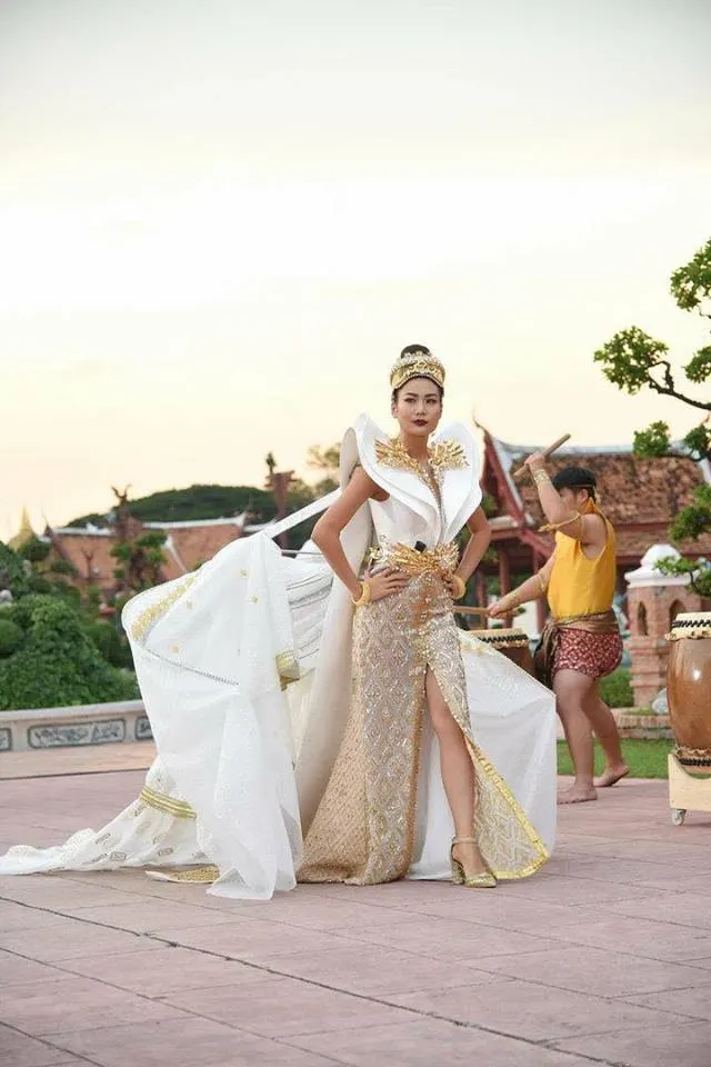 สำหรับชุดประจำชาติ “Chang The Icon of Siam” มีองค์ประกอบชุดเป็น 3 ส่วนด้วยกัน คือส่วนที่ 1 “ชุดไทยประยุกต์” ออกแบบชุดขึ้นใหม่โดยดัดแปลงจากชุดไทยพระราชนิยมโดยใช้ผ้าไหม เพิ่มความ ทันสมัยด้วยชายผ้า ฟอร์มไหล่ยกสูงมาจากชุดไทยพระราชนิยมมาประยุกต์โดยอิงโครงสร้างมาจากหน้าช้าง ส่วนลายผ้าดัดแปลงจากลายประจำยามและลายกระจัง ซึ่งเป็นลายไทยมาตรฐาน ปักและรีดลายด้วยคริสตัล จากสวารอฟสกี้