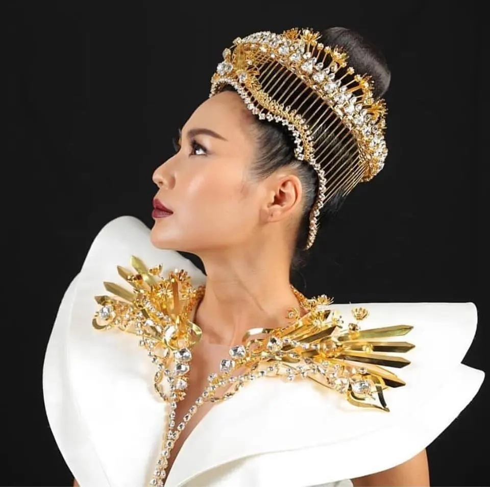 ส่วนที่ 2 “ชุดเครื่องประดับ” มี 3 ชิ้นหลัก คือ “เครื่องหัว” ดัดแปลงมาจากชฎา ออกแบบใส่ลายเส้น ลดทอนลายไทยเพื่อให้ดูทันสมัยขึ้น ชิ้นที่ 2 “กรองคอ” รูปตัว V ออกแบบการออกแบบเน้นช่วงหัวไหล่ และให้เข้ากับรูปทรงของฟอร์มชุด เพิ่มความอ่อนหวานด้วยโลหะชุบทองจัดช่อเป็นดอกไม้ไหว และใช้เทคนิค เดียวกันในการจัดทำเครื่องประดับชิ้น 3 คือ “เข็มขัดประดับเอว” โดยเครื่องประดับทุกชิ้นประดับด้วยคริสตัลจาก สวารอฟสกี้