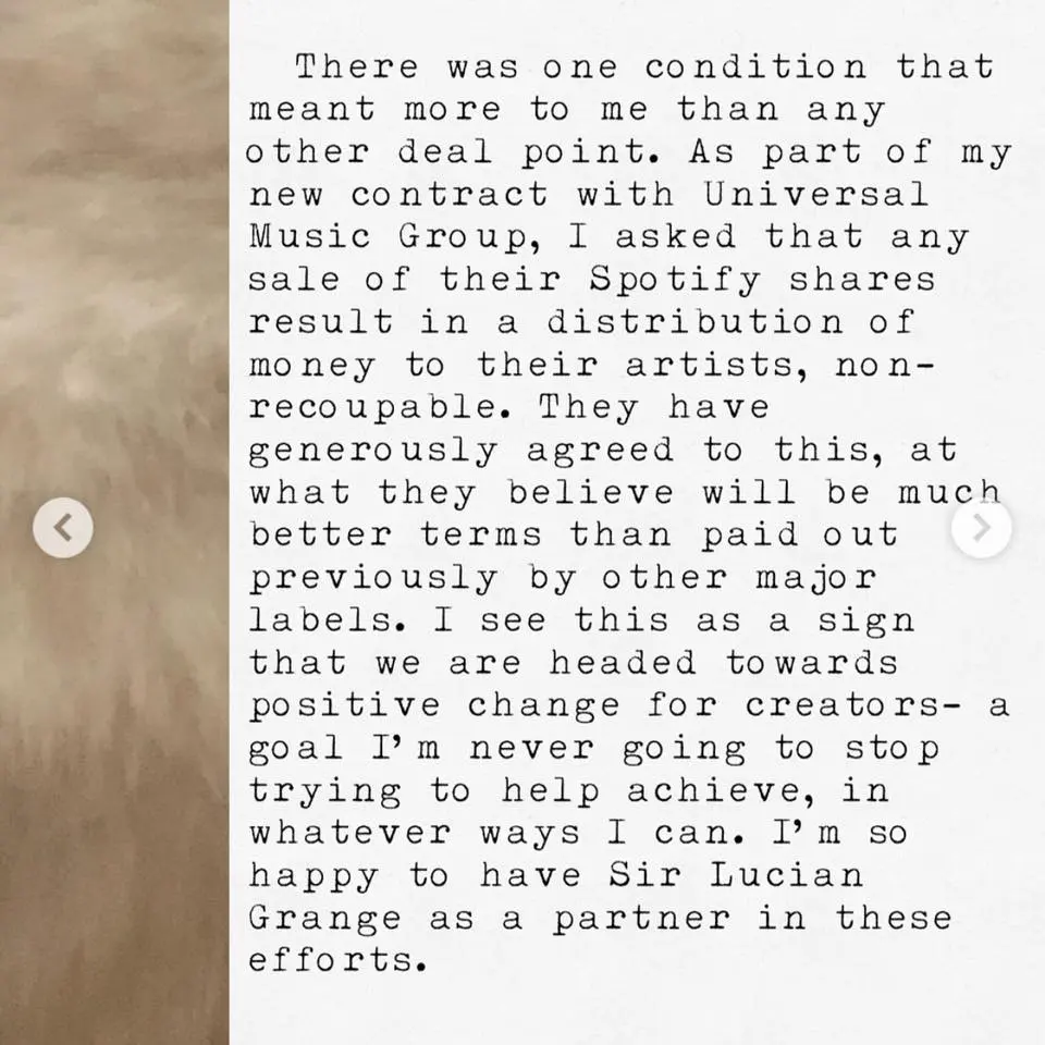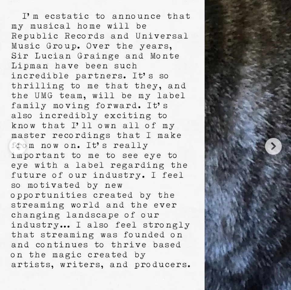 Taylor Swift ย้ายค่ายอย่างเป็นทางการ โดยเธอไปอยู่ภายใต้ชายคาของ Republic Records และ Universal Music Group ซึ่งหนึ่งในสาเหตุที่เธอตกลงปลงใจกับUMGคือ พวกเค้าเห็นด้วยกับเธอ เรื่องเรียกร้องส่วนแบ่งของศิลปินหน้าใหม่จากยอดสตรีมบน Spotify