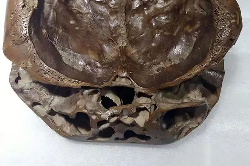 เมื่อสำรวจไป จึงพบว่า มันคือ "กระโหลก" แต่ไม่ใช่ของมนุษย์อย่างแน่นอน เพราะ มันมีความ แบนและเป็นสีน้ำตาล เส้นผ่าศูนย์กลางยาว 16 เซนติเมตร คล้ายกระโหลกมนุษย์แต่มันก็ไม่ได้เหมือนซะทีเดียว