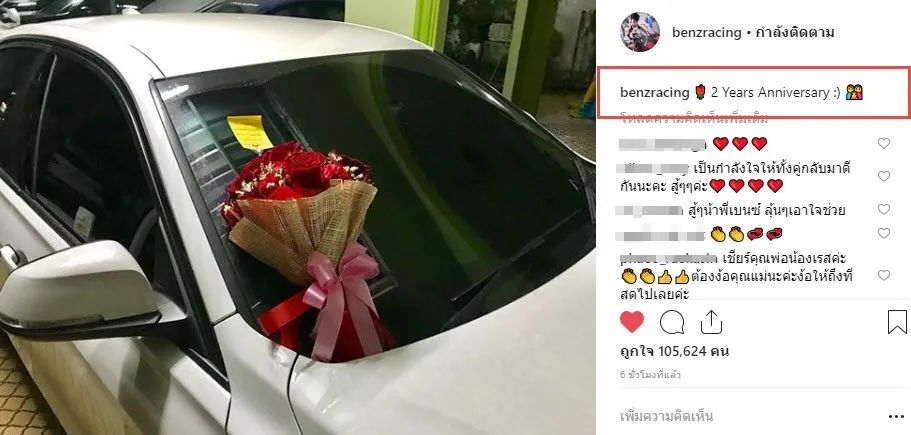 ล่าสุดเมื่อเช้ามืดที่ผ่านมา (21 พ.ย. 61) "เบนซ์ เรซซิ่ง" ได้หอบช่อดอกกุหลาบสีแดง พร้อมกระดาษโน็ตไปวางเอาไว้หน้ารถของ "แพท ณปภา" ก่อนจะระบุแคปชั่นและแท็กชื่อหาสาวแพทว่า "2 Years Anniversary :)" เพราะ เมื่อวานนี้ (20 พ.ย. 61) เป็นวันครบรอบที่ "เบนซ์ - แพท" แต่งงานกันครบ 2 ปีแล้ว ซึ่งงานนี้เหล่าแฟนคลับต่างก็ออกมาแสดงความยินดีกันใหญ่ ว่าทั้งคู่คงจะได้กลับมาคืนดีกันเร็วๆ นี้