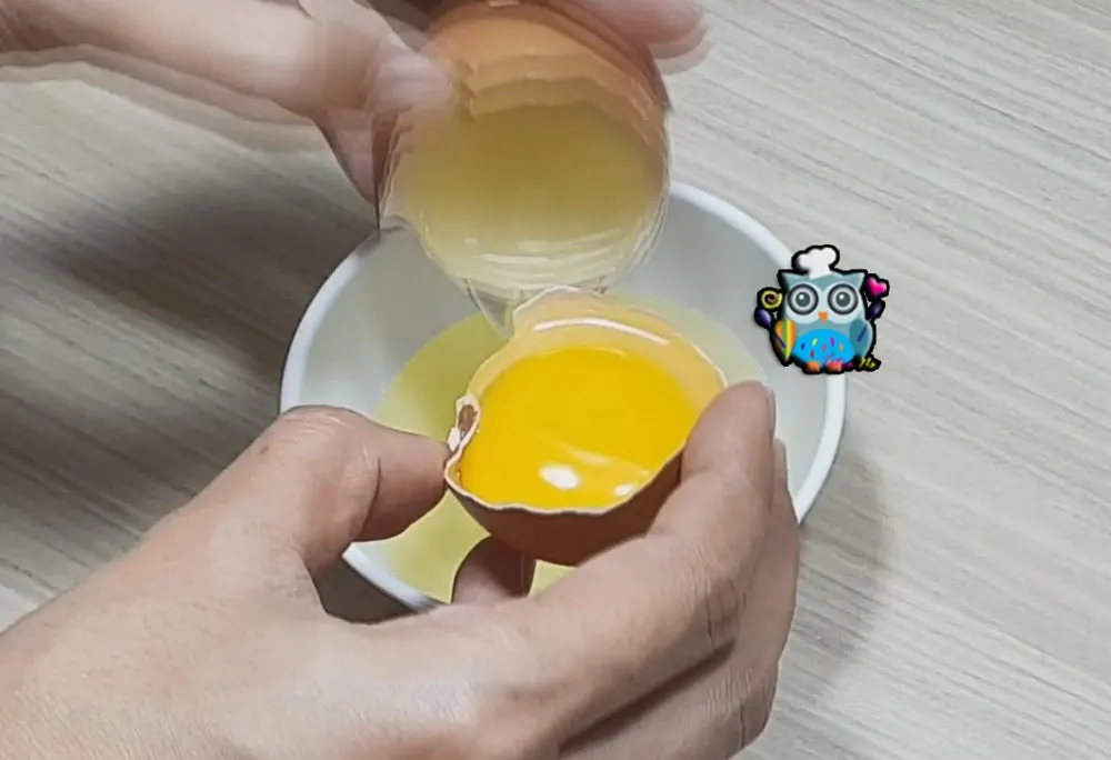 2.ตอกไข่ขาวแยกกับไข่แดง ตีไข่ขาวให้ขึ้นฟองฟู