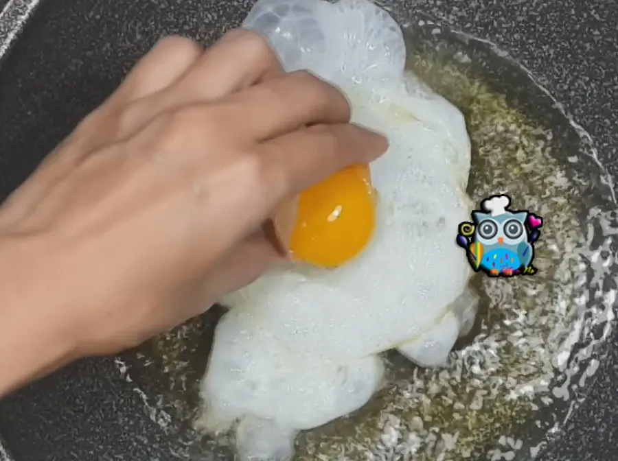 3.ตั้งกระทะใส่น้ำมันเยอะนิดหนึ่ง รอจนน้ำมันร้อนจัดใส่ไข่ขาวลงไปทอด หยอดไข่แดงตามลงไป พอไข่ขาวสุกเหลืองตักขึ้นพักไว้ก่อน