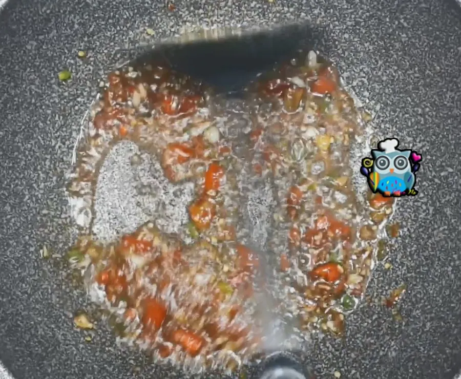 4.ตักน้ำมันในกระทะออก เหลือสัก 4 ช้อนโต๊ะ ใส่พริกกระเทียมที่โขลกไปลงไปผัดจนหอมฉุน