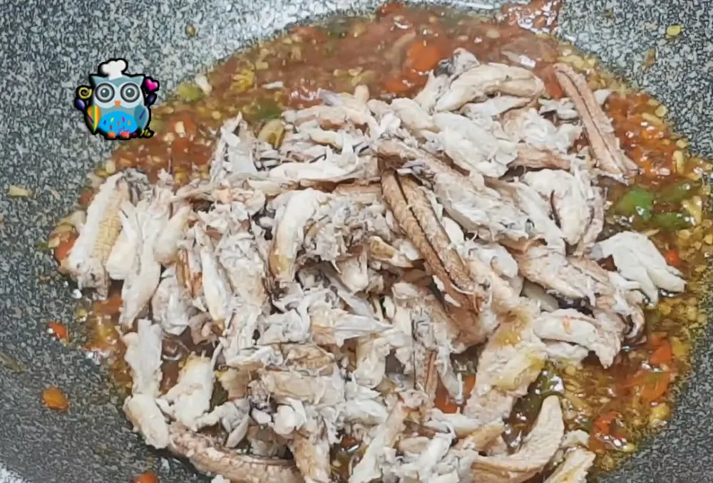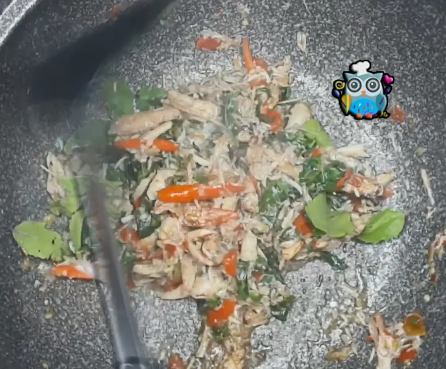 6.ใส่เนื้อปูและใบกะเพรา เร่งไฟ