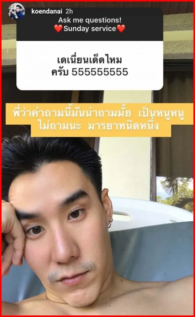 ล่าสุดทำเอาหนุ่มเขื่อนถึงกับปรี๊ด ได้โพสต์ไอจีสตอรี่เป็นคำถามของชาวเน็ตที่ถามเรื่องส่วนตัวอย่างไร้มารยาท โดยมีคำถามที่ทำให้หนุ่มเขื่อถึงกับเดือด “แอบชอบตั้งนาน เสียดายเป็นตุ๊ด” หนุ่มเขื่อนก็ได้ตอบว่า “ไม่เห็นต้องเสียดายครับ พี่เป็นไม่เป็นพี่ก็คงไม่ได้เป็นคนในชีวิตน้องอยู่แล้ว (ยิ้ม)” ส่วนคำถามที่ถามว่า “เดเนี่ยนเด็ดไหม!?” หนุ่มเขื่อนตอบว่า “พี่ว่าคำถามนี้มันน่าถามมั้ย เป็นหนูหนูไม่ถามนะ มารยาทนิดนึง
