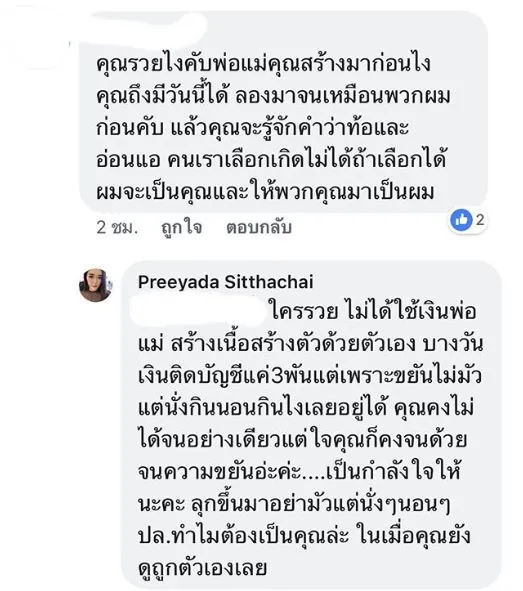 จากนั้น สาวแก้มบุ๋ม ก็ได้คอมเม้นต์ตอบกลับไปอย่างเรียบๆว่า “ใครรวย ไม่ได้ใช้เงินพ่อแม่ สร้างเนื้อสร้างตัวด้วยตัวเอง บางวันเงินติดบัญชีแค่ 3 พัน แต่เพราะขยันไม่มัวแต่นั่งกิน นอนกินไงเลยอยู่ได้ คุณคงไม่ได้จนอย่างเดียว แต่ใจคุณคงจนด้วย จนความขยันอะค่ะ…เป็นกำลังใจให้นะคะ ลุกขึ้นมาอย่ามัวแต่นั่งๆนอนๆ ปล.ทำไมต้องเป็นคุณล่ะ ในเมื่อคุณยังดูถูกตัวเองเลย”