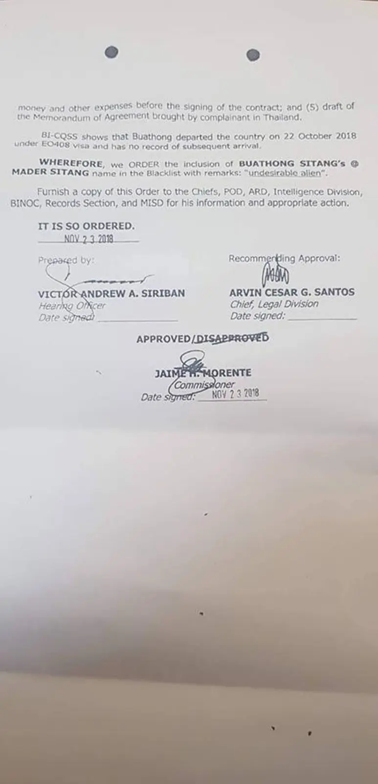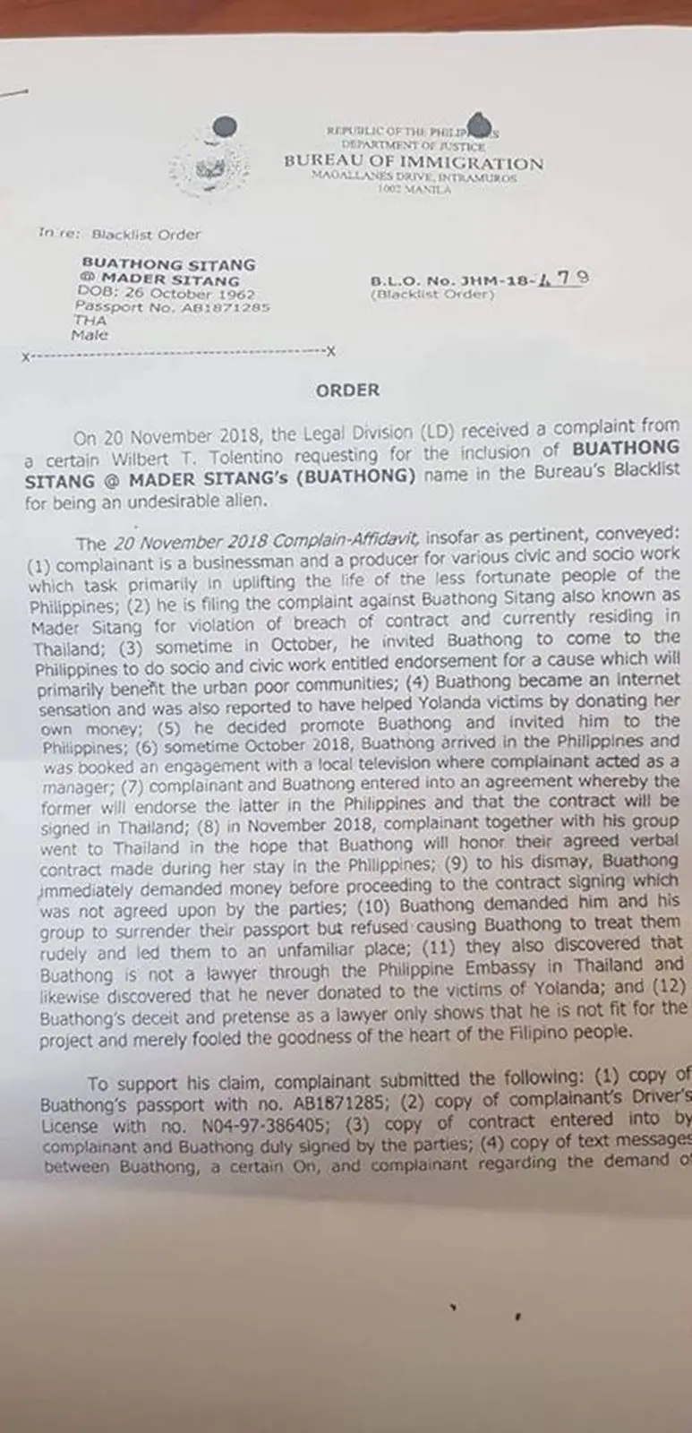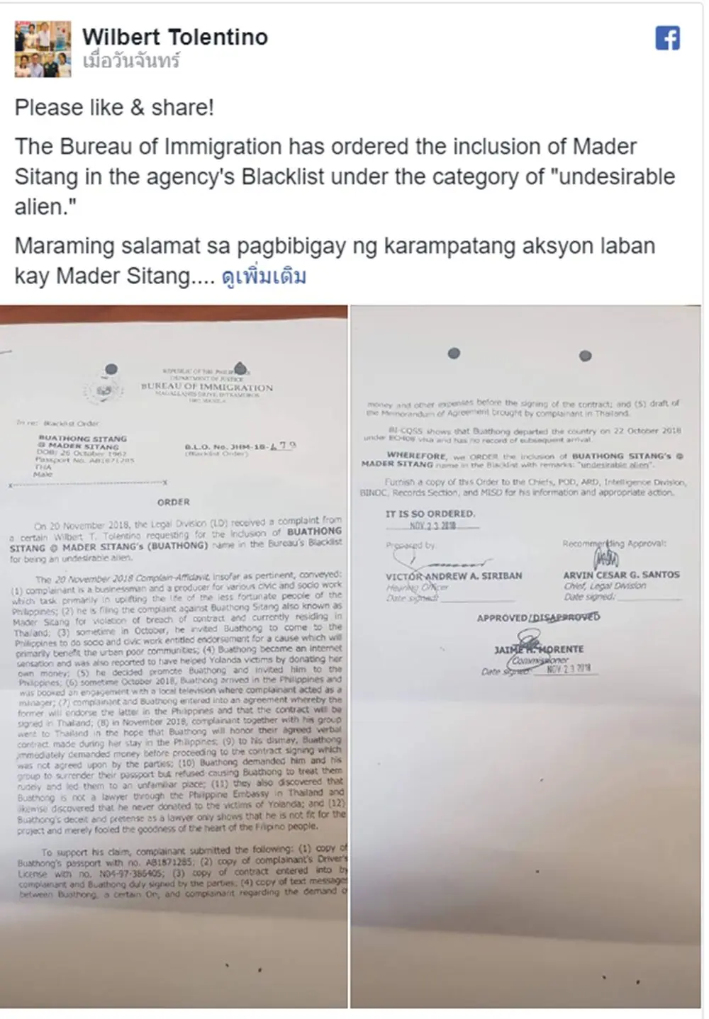 สำนักข่าว ABS-CBN ฟิลิปปินส์ รายงานว่า ผู้ผลิตรายการโชว์ในฟิลิปปินส์ วิลเบิร์ต โทเลนติโน โพสต์เฟซบุ๊กส่วนตัวถึง สิตางศุ์ บัวทอง เน็ตไอดอลสาวสองคนดังของไทย ว่า เจ้าหน้าที่สำนักงานตรวจคนเข้าเมืองฟิลิปปินส์ได้อนุมัติคำร้องขอขึ้นบัญชีดำ สิตางศุ์ ห้ามเดินทางเข้าประเทศ ในฐานะ “บุคคลต่างด้าวซึ่งไม่เป็นที่ต้อนรับ” เมื่อวันที่ 23 พ.ย.ที่ผ่านมา มีการอ้างว่า สิตางศุ์ ละเมิดข้อตกลงในสัญญาว่าจ้างงาน โดยโทเลนติโนได้โพสต์ขอบคุณที่ปรึกษาด้านกฏหมายที่คอยช่วยเหลือ รวมถึงสถานเอกอัครราชทูตฟิลิปปินส์ประจำประเทศไทย ที่ช่วยดูแลเพื่อให้เกิดความยุติธรรม