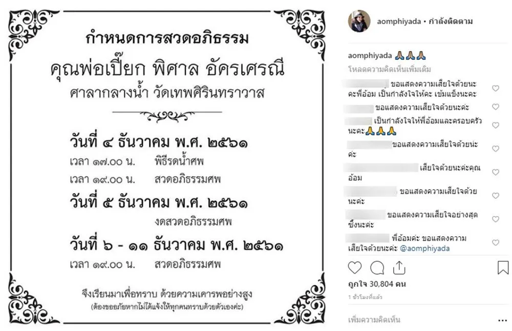 โดยทาง "อ้อม พิยดา อัครเศรณี" ได้แจ้งกำหนดการสวดพระอภิธรรมศพ "เปี๊ยก-พิศาล อัครเศรณี" ผ่านทางอินสตาแกรมส่วนตัว โดยระบุว่า
