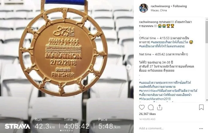 “ก้อย รัชวิน” สุดภูมิใจ ชูธงชาติไทยผืนใหญ่ ผงาดคว้าที่ 3 มาราธอนที่มาเก๊า