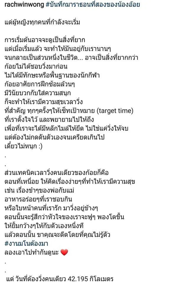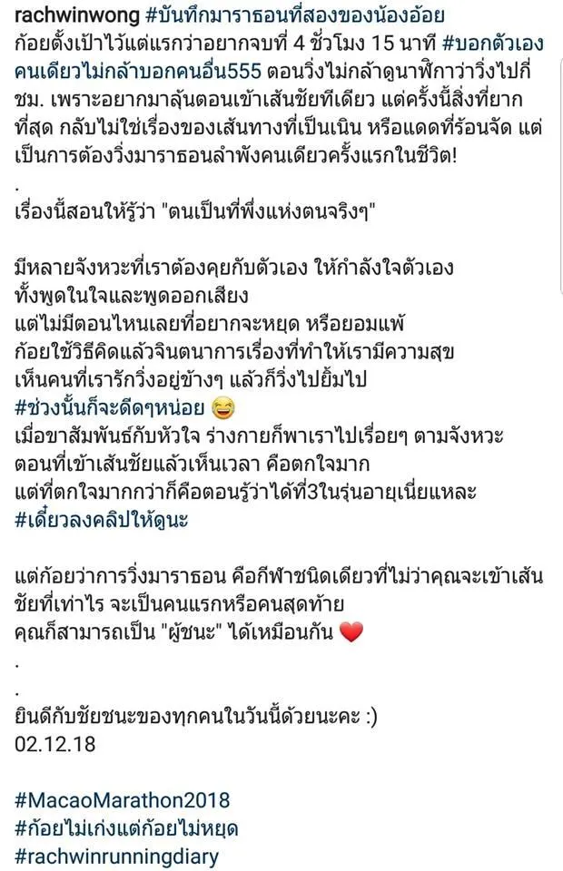 สำหรับสาวร่างเล็กมากความสามารถ อย่างก้อย-รัชวิน วงศ์วิริยะ ที่ตอนนี้ทุ่มเทให้กับการวิ่ง จนสามารถวิ่งมาราธอน ในระยะทาง 42.195 กิโลเมตร ได้แล้ว โดยเธอได้วิ่งมาราธอนครั้งแรกเมื่อช่วงต้นปีที่ผ่านมา ในรายการ เกียวโต มาราธอน 2018 ที่ประเทศญี่ปุ่น