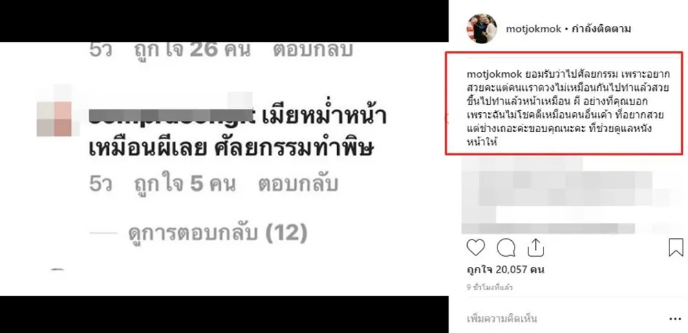 งานนี้คุณมดก็ไม่ได้นิ่งเฉย เจ้าตัวได้เเคปคอมเม้นต์คนที่เข้ามาต่อว่าพร้อมตอบกลับเเบบนิ่มๆว่า " ยอมรับค่ะว่าไปศัลยกรรม เพราะอยากสวยค่ะ เเต่คนเราดวงไม่เหมือนกันไปทำเเล้วสวยขึ้น ไปทำเเล้วหน้าเหมือนผีอย่างที่คุณบอก เพราะฉันไม่ได้โชคดีเหมือนคนอื่นเค้าที่อยากสวย เเต่ช่างเถอะค่ะ ขอบคุณนะคะที่ช่วยดูเเลหนังหน้าให้ "