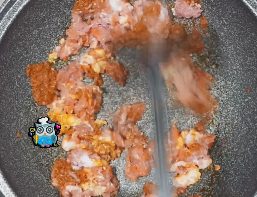 2.ใส่น้ำมันผัดกับพริกแกงจนหอม ใส่เนื้อวัวสับลงไป ผัดคลุกให้เข้ากับพริกแกง