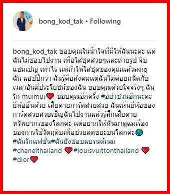 เพราะล่าสุดแบรนด์ดังอย่าง Miumiu ได้ส่งการ์ดเชิญสาวตั๊กไปร่วมงานด้วย แต่สาวตั๊กก็ปฏิเสธไป เธอเผยว่า เธอไม่ชอบไปงานเพื่อใส่ชุดสวยๆ จิบแชมเปญเท่าไร แต่ถ้าให้ใส่ชุดเเล้วลงigอันนั้แฮปปี้กว่า เพราะเธอคำนึงถึงเวลาที่มีค่าของตัวเองมากกว่า วอนอย่าส่งมาการ์ดมาเชิญอีกเพราะว่าเปลืองทรัพยากรธรรมชาติ รวมถึงแบรนด์อื่นด้วย