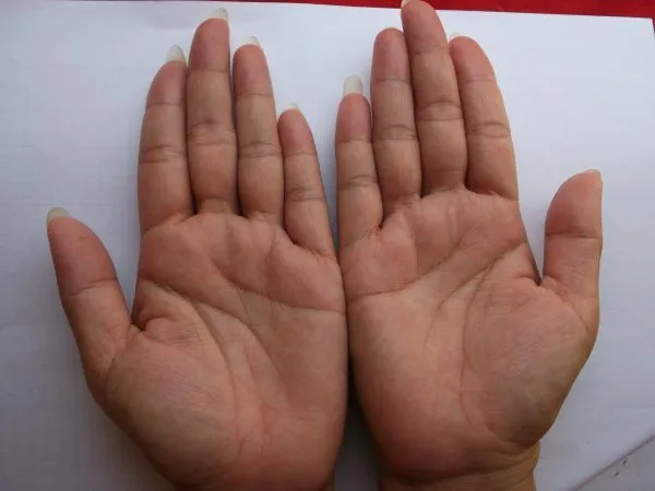 เมื่อแบมือออก ถ้าฝ่ามือขาวแถมหยาบ แปลว่าจะต้องทำงานหนัก ถ้าบนฝ่ามือขาวๆมีสีแดงระเรื่อ มือแบบนี้เป็นมือของคนรวย ไม่ต้องพยายามมาก ก็มีเงินใช้ไม่ขาดมือ