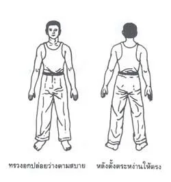 1. ยืนตรงตัว เข่าไม่งอ แยกเท้าทั้งสองข้างออกจากกัน โดยมีระยะห่างประมาณความกว้างหัวไหล่