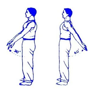 7. แกว่งแขนไปข้างหน้าเบาหน่อย ทำมุม 30 องศากับลำตัว หายใจเข้า แล้วแกว่งไปข้างหลังแรงหน่อย ทำมุม 60 องศากับลำตัว จะทำให้เกิดแรงเหวี่ยง หายใจออกขณะแกว่งไปข้างหลัง นับเป็น 1 ครั้ง โดยปล่อยน้ำหนักมือให้เหมือนลูกตุ้ม และต้องสะบัดมือทุกครั้ง เพื่อให้เลือดหมุนเวียนไปถึงปลายนิ้ว
