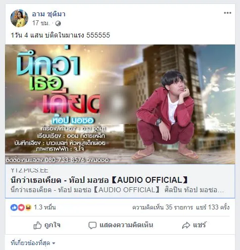 ซึ่งเพลงใหม่นั้นเป็นผลงานการแต่งของอามชุติมาแบบล้วนๆทั้งนี้อามชุติมายังช่วยโปรโมทหน้า Facebook ของเธอด้วยโดยเธอได้โพสต์คลิปเพลงพร้อมแคปชั่นที่ว่า….. 1วัน 4 แสน บ่ติดในมาแรง 555555 ถือว่ามาแรงจริงๆสำหรับเพลงดังกล่าวเพราะตอนนี้นั้นยอดวิวยังเพิ่มขึ้นอย่างต่อเนื่องกับเนื้อเพลงแบบว่าของผู้ชายบ้านๆเอาเป็นว่าตัวเองนั้นจะเป็นอย่างไรและเฉพาะแค่ไหนฝีมือการแต่งเพลงล่าสุดของอามชุติมาเราไปฟัง (คลิป)