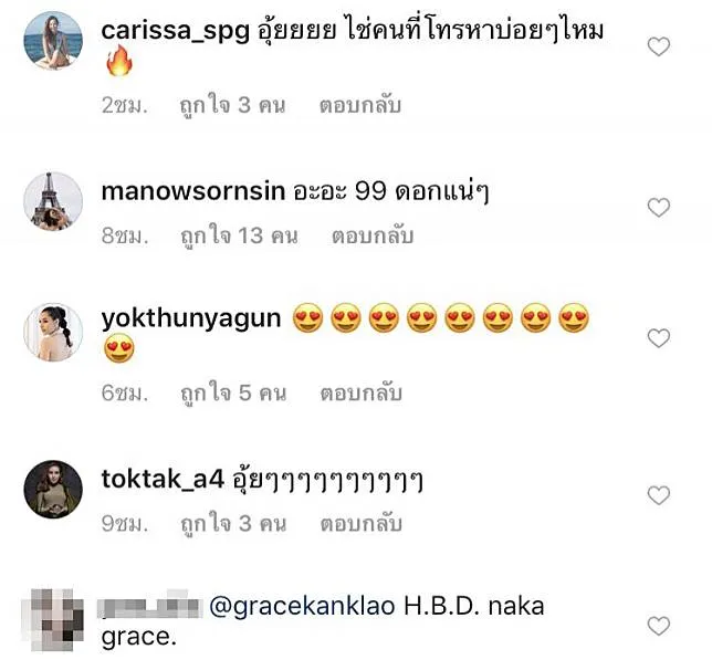 หลังจากที่เลิกรากับไฮโซหนุ่มขุนพล อิสสระ ไปได้พักใหญ่ๆ นางเอกสาวขาวโบ๊ะอย่าง เกรซ กาญจน์เกล้า ก็ยังโสดๆ หัวใจว่างไร้คนจับจองอยู่แบบสวยๆ แต่มาวันนี้เจ้าค่าที่เป็นวันคล้ายวันเกิดของเธอ เจ้าตัวก็ลงรูปดอกกุหลาบปริศนาพร้อมแคปชั่นว่า”Surprised! #จำนวนดอกบอกอายุ #นับเอานะจ๊ะ” อุ้ยๆ มีการเซอร์ไพรส์แบบนี้เห็นทีว่าคงจะไม่ใช่คนธรรมดาแน่ๆ อะเนอะ ซึ่งก็ไม่รู้ว่าหนุ่มเจ้าของดอกไม้นี้คือใคร แต่ที่แน่ๆ น้องสาวคนสนิทคาริสา สปริงเก็ตต์ ก็เข้ามาคอมเม้นท์แซวซะว่า”อุ้ยๆ ใช่คนที่โทรหาบ่อยๆ ไหม” ว้ายตายแล้ว! มาทิ้งระเบิดไว้แบบนี้เห็นทีว่าเจ้าตัวคงต้องอัปเดตสถานะหัวใจหน่อยแล้วล่ะว่าไม่โสดแล้วจริงหรือไม่จ๊ะสาวเกรซ คริคริ…
