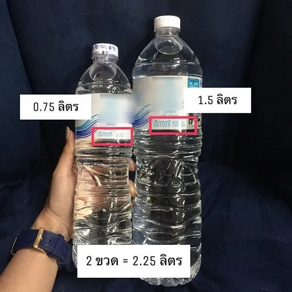 จะดื่มน้ำ 2 ขวดนี้(0.75 ลิตร กับ 1.5 ลิตร) ให้หมดใน 1 วัน เพราะผู้หญิงควรดื่มน้ำ 2.2 ลิตรหรือประมาณ 9 แก้วต่อวัน