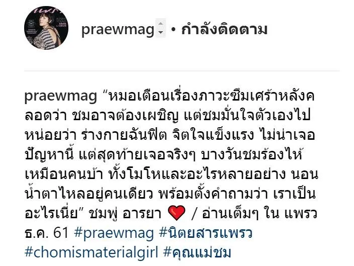 “หมอเตือนเรื่องภาวะ โรคซึมเศร้าหลังคลอดว่า ชมอาจต้องเผชิญ แต่ชมมั่นใจตัวเองไปหน่อยว่า ร่างกายฉันฟิต จิตใจแข็งแรง ไม่น่าเจอปัญหานี้ แต่สุดท้ายเจอจริง ๆ บางวันชมร้องไห้เหมือนคนบ้า ทั้งโมโหและอะไรหลายอย่าง นอนน้ำตาไหลอยู่คนเดียว