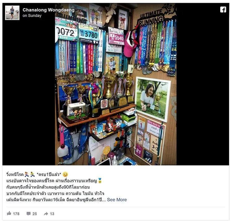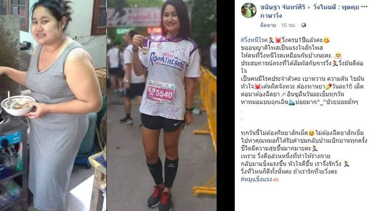 และล่าสุด ในเฟซบุ๊กกลุ่ม วิ่งไหนดี : พูดคุยภาษาวิ่ง เป็นเฟสบุ๊คของกลุ่มคนที่ชอบการวิ่ง โดยมีผู้ใช้เฟซบุ๊กชื่อว่า ขนิษฐา จันทร์ศิริ โพสต์เล่าเรื่องราวจากการวิ่ง ซึ่งเปลี่ยนชีวิตของตนไปเลย จากคนที่มีน้ำหนักเกิน ป่วยด้วยหลายโรค กลับมาเป็นคนที่สมบูรณ์และแข็งแรง แถมหุ่นยังดีอีกด้วย โดยเจ้าตัวได้โพสต์ภาพก่อนและหลังพร้อมข้อความว่า…