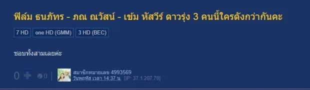 งานนี้ชาวเน็ตเค้าตัดสินใจไม่ถูก ถึงขั้นไปตั้งกระทู้ถามในpantip.com ว่า ใครกันที่หล่อสุดและมีสิทธิ์คว้ารางวัล ดาวรุ่งชายจากเวทีประกาศรางวัลบ้านเราไปครอง ส่วนคอมเม้นจากชาวเน็ตก็ออกแนว ติ่งใครก็ติ่งมัน เกทับบลัฟแหลกไม่มีใครยอมใคร เถียงกันดุเด็ดลยทีเดียว