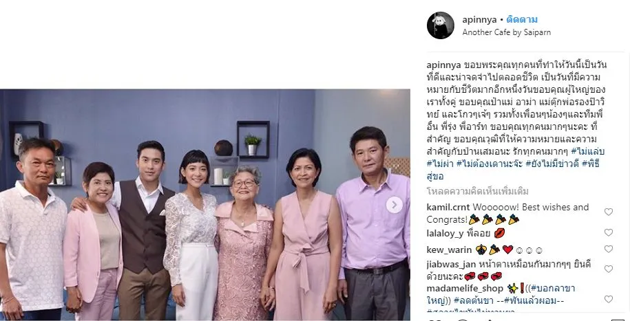 ล่าสุด สายป่าน ได้โพสต์ในอินสตาแกรม เกี่ยวกับเรื่องราวที่เกิดขึ้นแล้วว่า “ขอบพระคุณทุกคนที่ทำให้วันนี้เป็นวันที่ดีและน่าจดจำไปตลอดชีวิต เป็นวันที่มีความหมายกับชีวิตมากอีกหนึ่งวันขอบคุณผู้ใหญ่ของเราทั้งคู่ ขอบคุณป๋าแม่ อาม่า แม่ตุ๊ก พ่อรอง ป๊าวิทย์ และโกวๆ เจ้ๆ รวมทั้งเพื่อนๆน้องๆ และทีมพี่อิ๋น พี่รุ่ง พี่อาร์ท ขอบคุณทุกคนมากๆ นะคะ ที่สำคัญ ขอบคุณวุฒิที่ให้ความหมายและความสำคัญกับป่านเสมอนะ รักทุกคนมากๆ #ไม่แล่บ #ไม่ผ่า #ไม่ต้องเดานะจ๊ะ #ยังไม่มีข่าวดี #พิธีสู่ขอ”